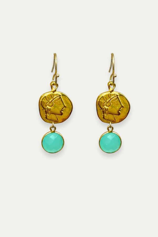 Inspired by Ancient Greek coinage, these striking earrings feature a detailed depiction of Goddess Athena embossed on sterling silver, finished with a double layer of 24K gold plating for lasting shine. Each piece is adorned with a faceted aqua chalcedony stone, known for its soothing and balancing properties.