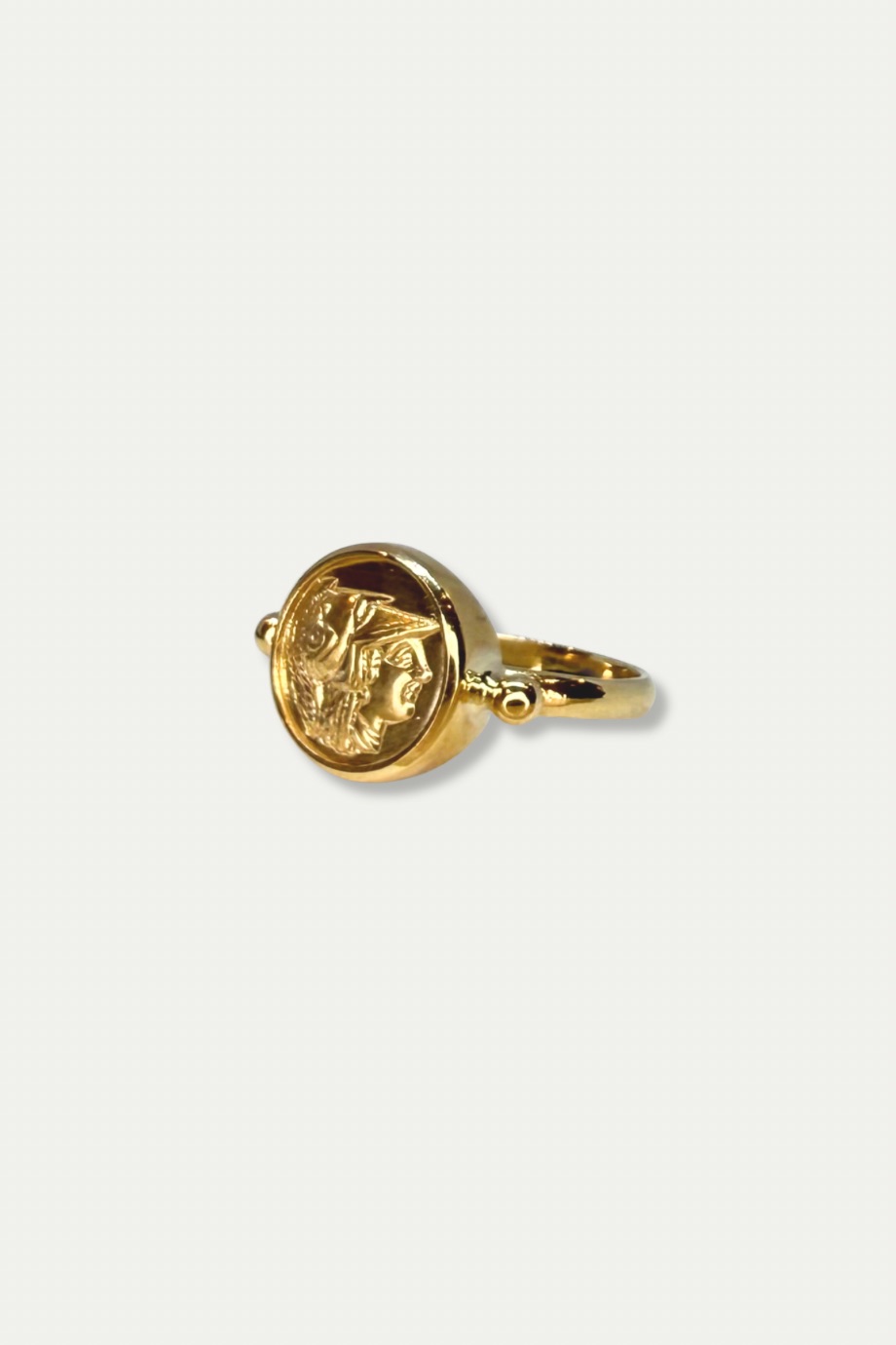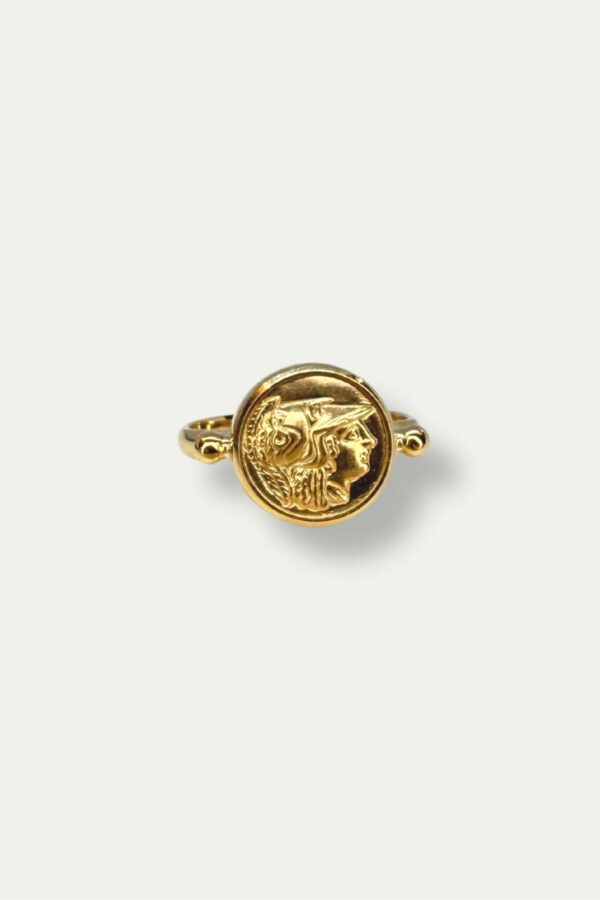 A timeless piece inspired by Ancient Greek heritage, this 14K gold ring features a detailed relief of goddess Athena, symbol of wisdom, courage, and strategy. The design is based on classical coin motifs, handcrafted to evoke the elegance of antiquity with a modern twist.