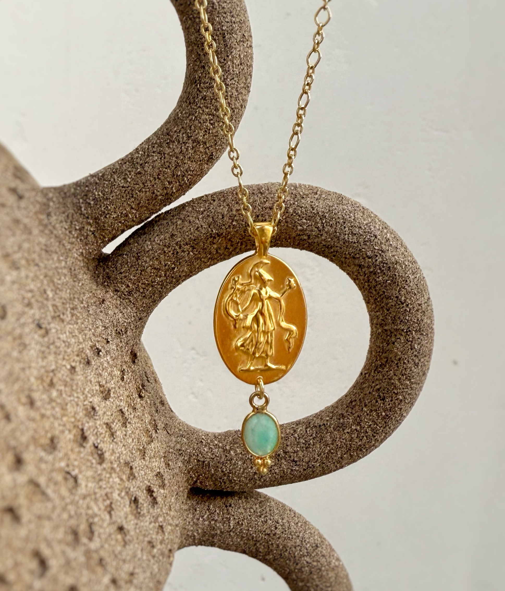 A powerful symbol of wisdom and strength, this handcrafted necklace features a bold pendant depicting the goddess Athena. Cast in sterling silver and luxuriously gold plated, the oval medallion is adorned with a soft green oval-cut amazonite drop, adding a touch of serene elegance. The design is inspired by Ancient Greek artistry and mythology, blending timeless heritage with modern minimalism.