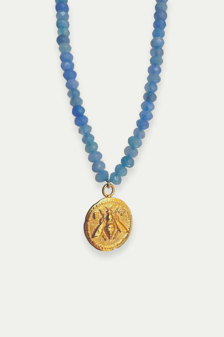 Inspired by the ancient Cretan bee coin, this necklace features a beautifully textured pendant made of sterling silver, plated in rich 24k gold. It hangs from a strand of faceted blue agate stones, offering vibrant color and symbolic protection. The bee is a timeless emblem of harmony, community, and fertility in Greek mythology.