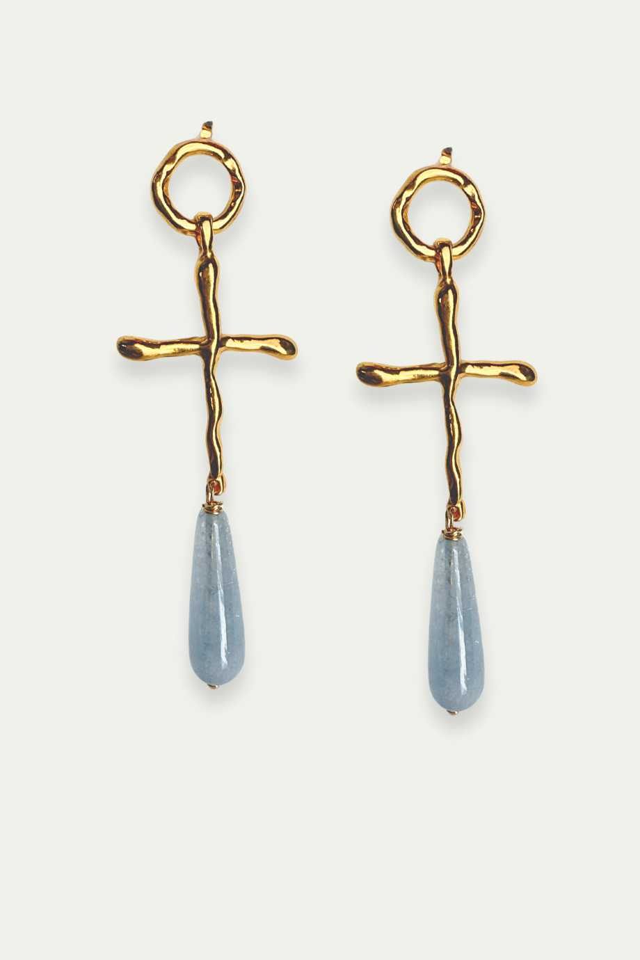 An elegant blend of symbolism and natural beauty, these limited-edition earrings feature handcrafted crosses with a molten texture, made from sterling silver and luxuriously plated in gold. Suspended from each cross is a teardrop-shaped amazonite stone, known for its calming energy and soft ocean-blue hue.