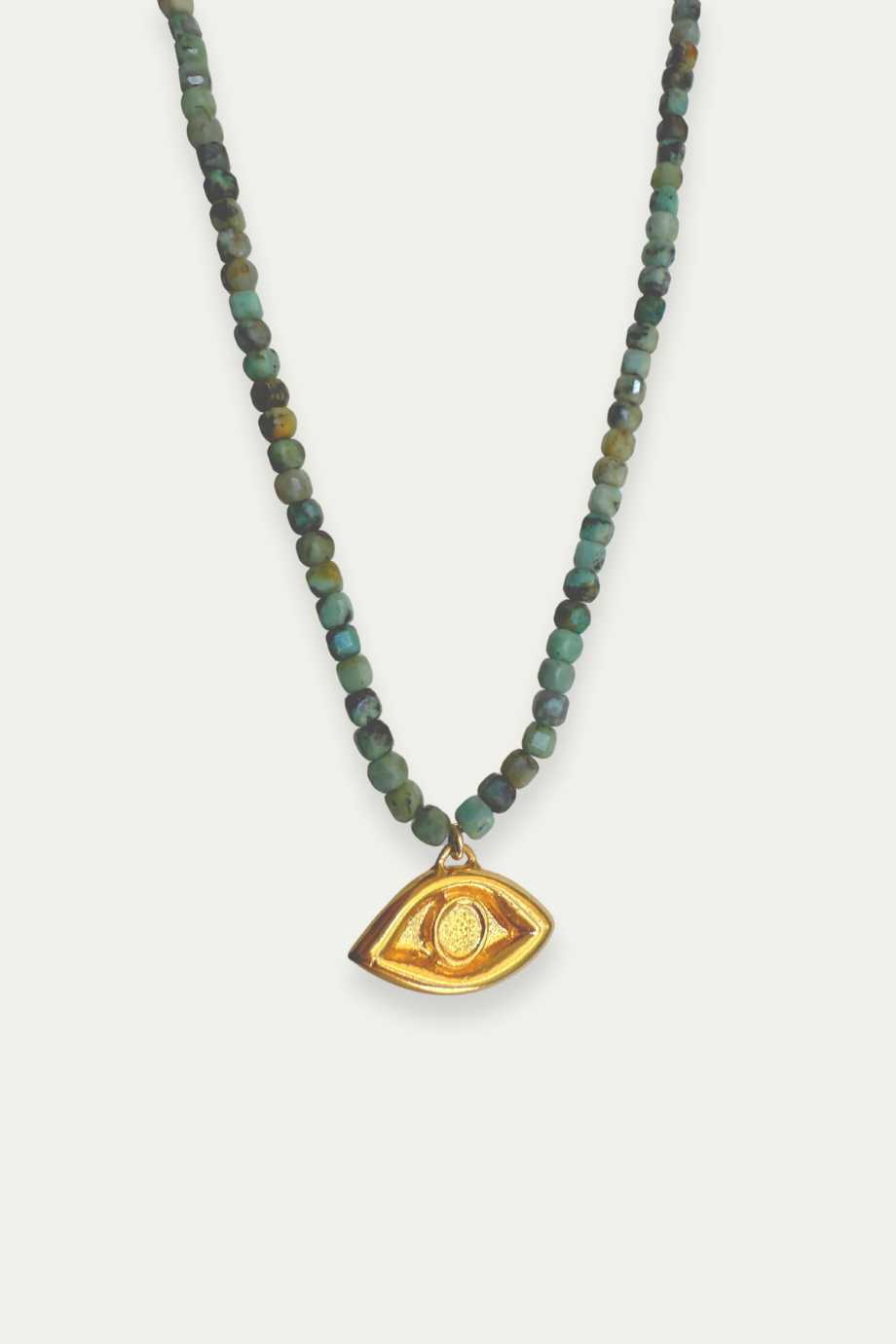 protective symbol meets natural beauty in this handcrafted necklace. Featuring a hand-sculpted eye pendant in sterling silver, gold plated, suspended on a strand of faceted turquoise stones . Adjustable to suit your neckline.