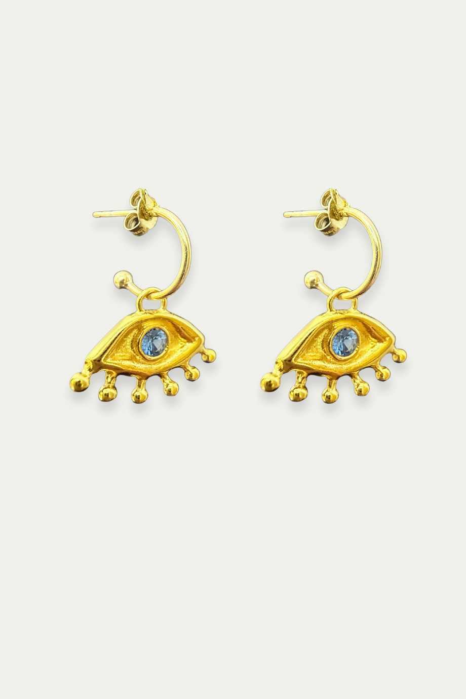 These earrings are playful yet protective, drawing inspiration from ancient Greek talismans while maintaining a modern, artistic flair.