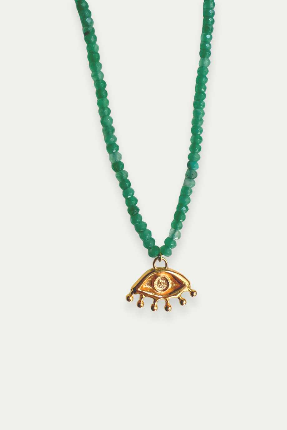 protective symbol meets natural beauty in this handcrafted necklace. Featuring a hand-sculpted eye pendant in sterling silver, gold plated, suspended on a strand of faceted agate stones . Adjustable to suit your neckline.
