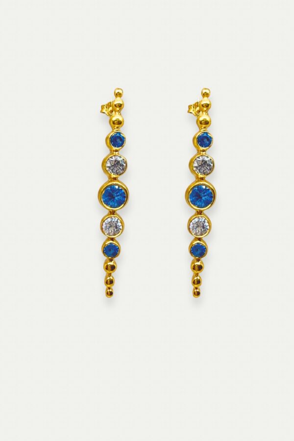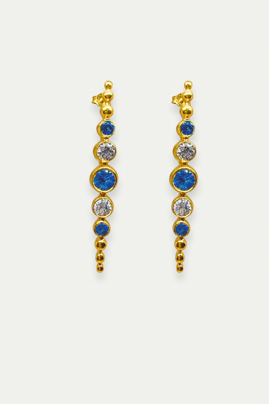 Elegant and modern, these one of a kind handmade drop earrings feature a rhythmic design of alternating blue and clear zirconia stones, set in gold-plated sterling silver (925). Their sleek vertical silhouette elongates the neck, making them perfect for both everyday wear and special occasions.