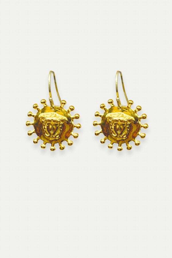 Bold and timeless, these handcrafted earrings feature a striking Medusa motif inspired by ancient Greek mythology. Cast in 925 sterling silver and finished with a double layer of 24K gold plating, the radiant surface and intricate relief design echo the grandeur of classical sculpture.