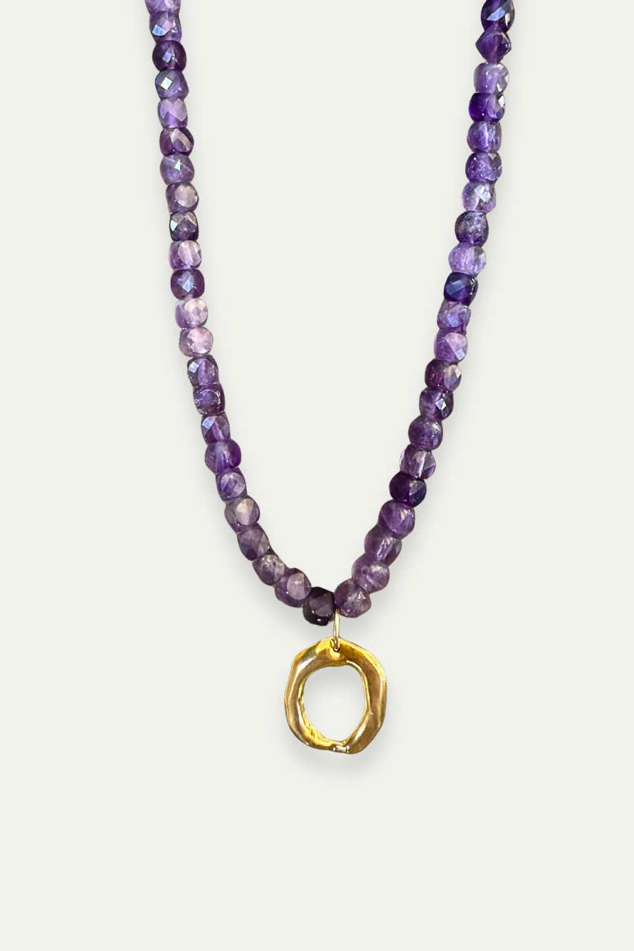 A blend of raw elegance and refined energy, this necklace features a molten-shaped pendant crafted in sterling silver 925 and plated in 24k gold, paired with vibrant, faceted amethyst stones. Each stone is hand-strung to highlight its natural beauty and deep purple tones – a color long associated with creativity, calm, and spiritual clarity.