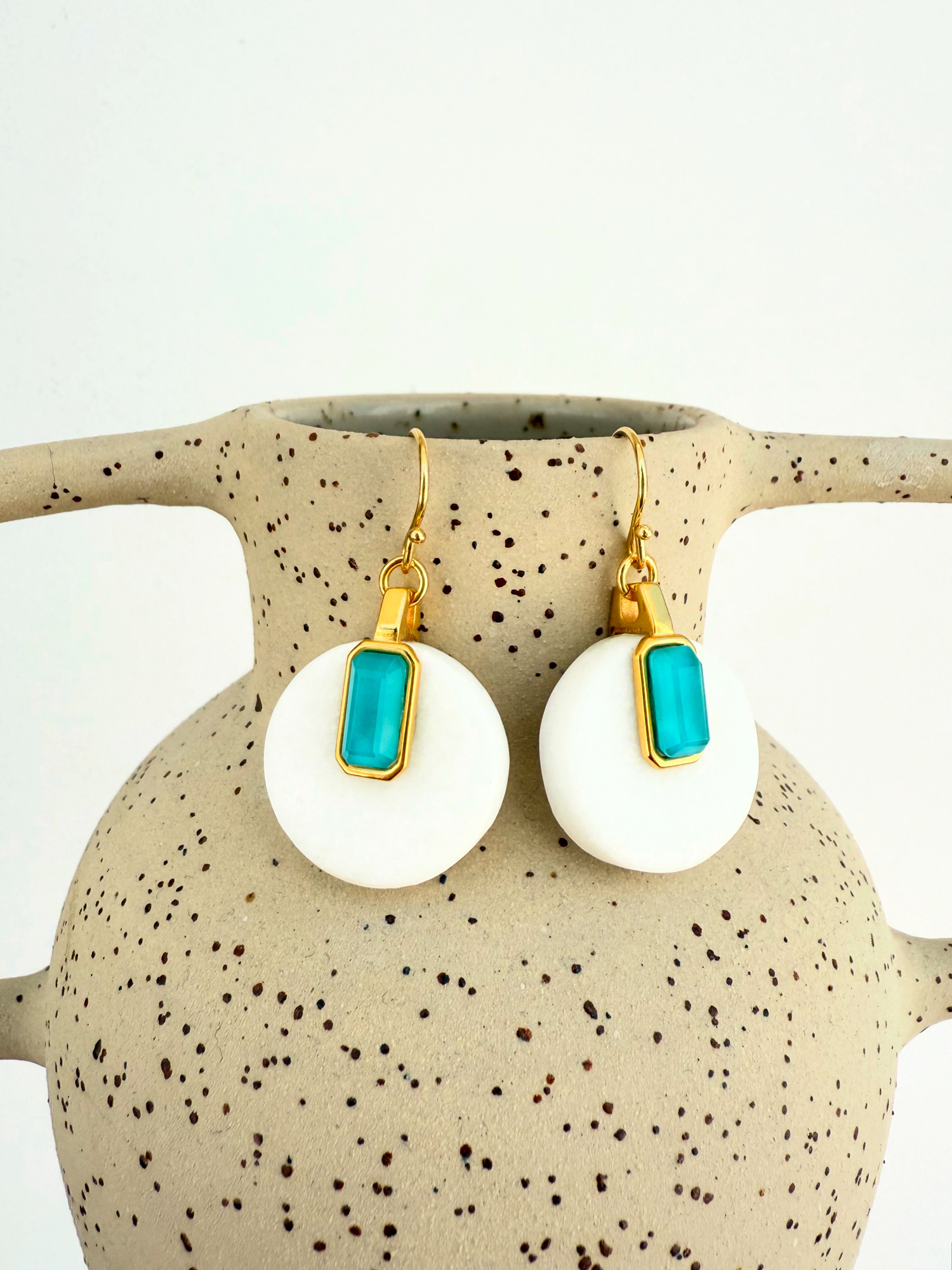 Elegant earrings crafted from natural white Thassos marble, adorned with vibrant doublet stones made of turquoise and transparent quartz. The contrast of the matte marble and the vivid stones creates a timeless design that feels both ancient and modern. Set in sterling silver and luxuriously gold plated, these earrings are part of a limited edition collection, celebrating Greek materials and craftsmanship.