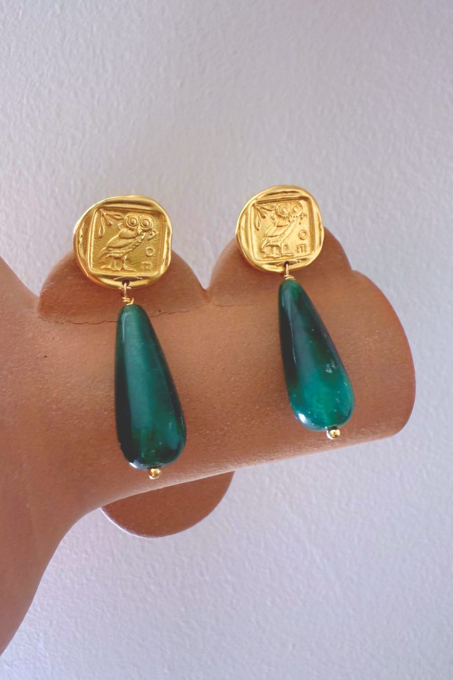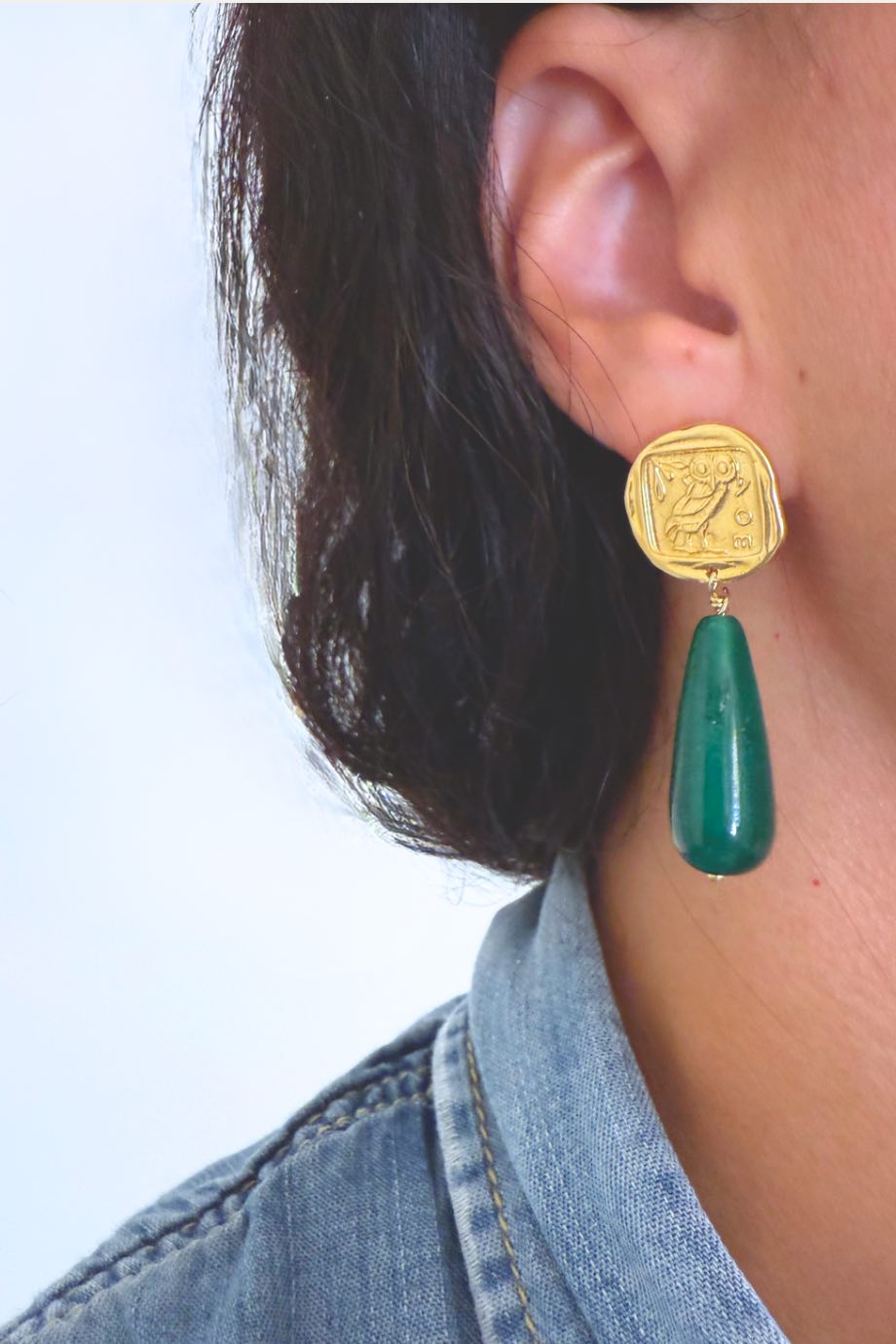 Striking and symbolic, these owl coin earrings are handcrafted from sterling silver 925, finished with a rich 18k gold plating, and feature vibrant natural jade drops. The upper part of the earring showcases an ancient Greek Athenian owl coin, symbolizing wisdom and protection, while the polished green jade adds elegance and grounding energy.