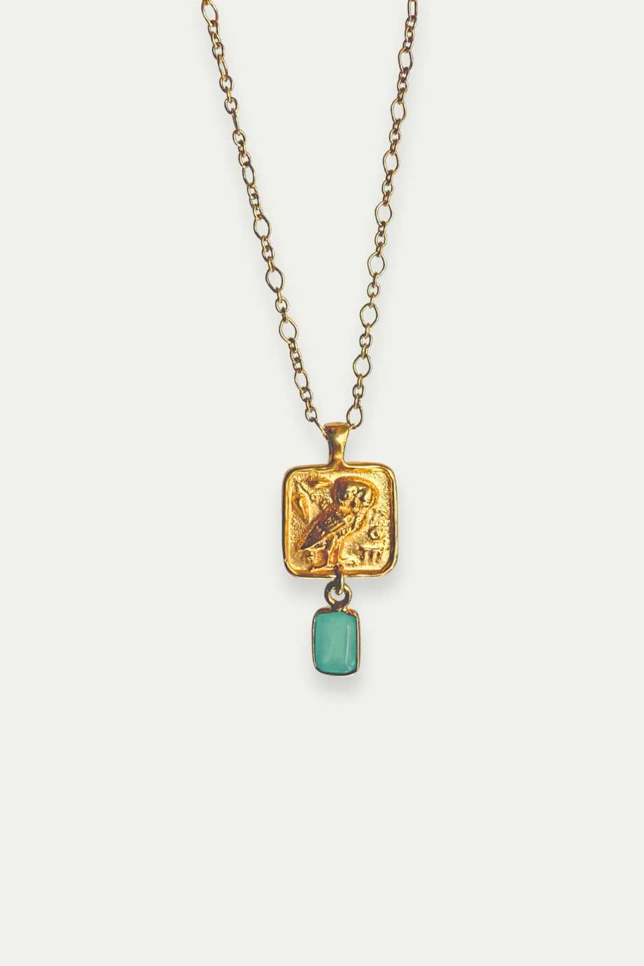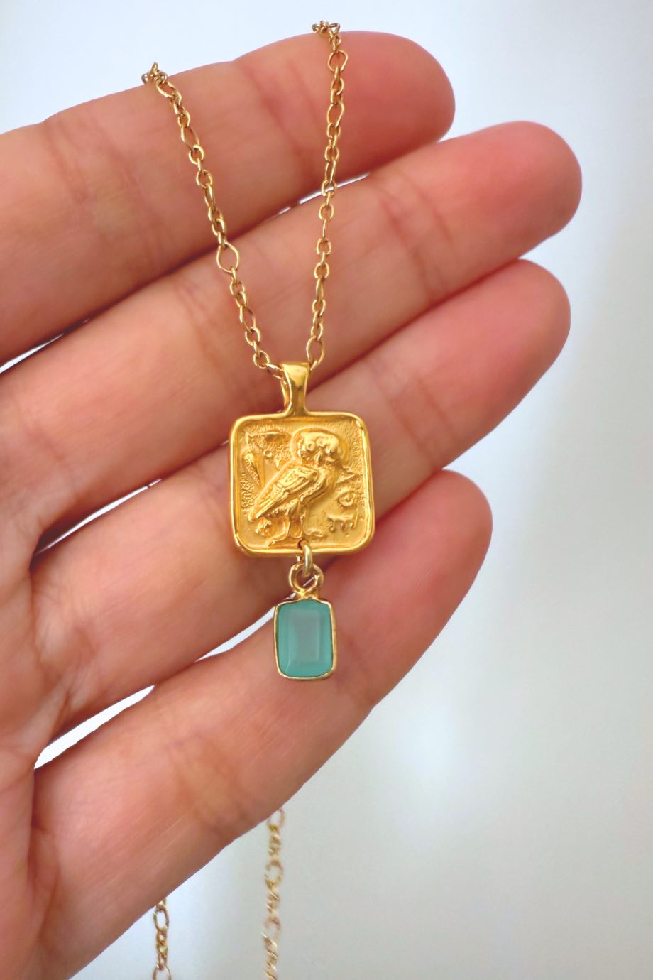 This handcrafted necklace features an ancient Greek owl coin motif — a timeless symbol of wisdom and protection — paired with a vibrant aqua chalcedony stone. The pendant is made of sterling silver gold plated, and hangs from a 45cm (17.7 inches) long chain.