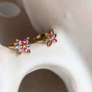 Gold 14k hoop earrings with pink tourmalines & blue topaz